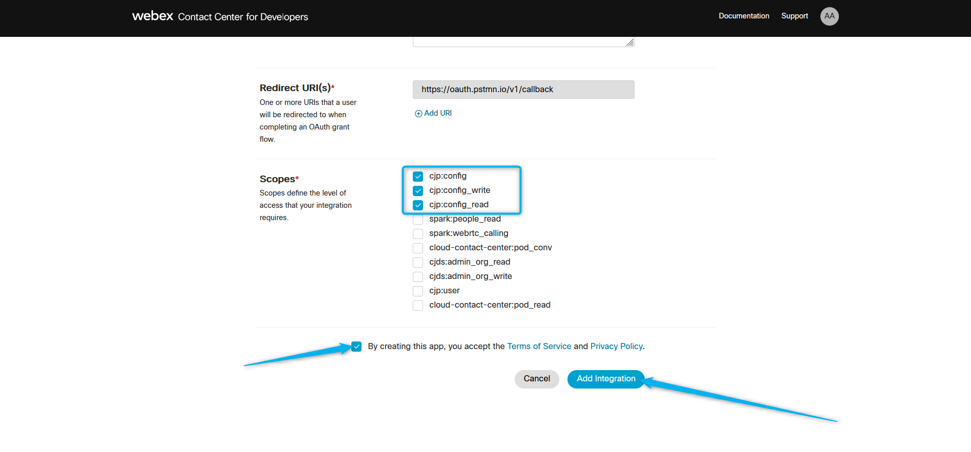Step 5. Select the scope: cjp:config; cjp:config_write; cjp:config_read, accept the Terms of Service and click on Add Integration.