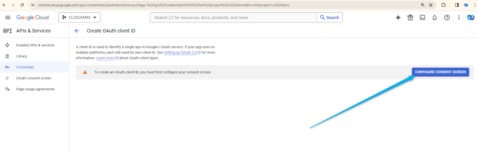 - If this is the first time you are creating the credentials you will be presented with the option to Configure Consent Screen page. Click on it.