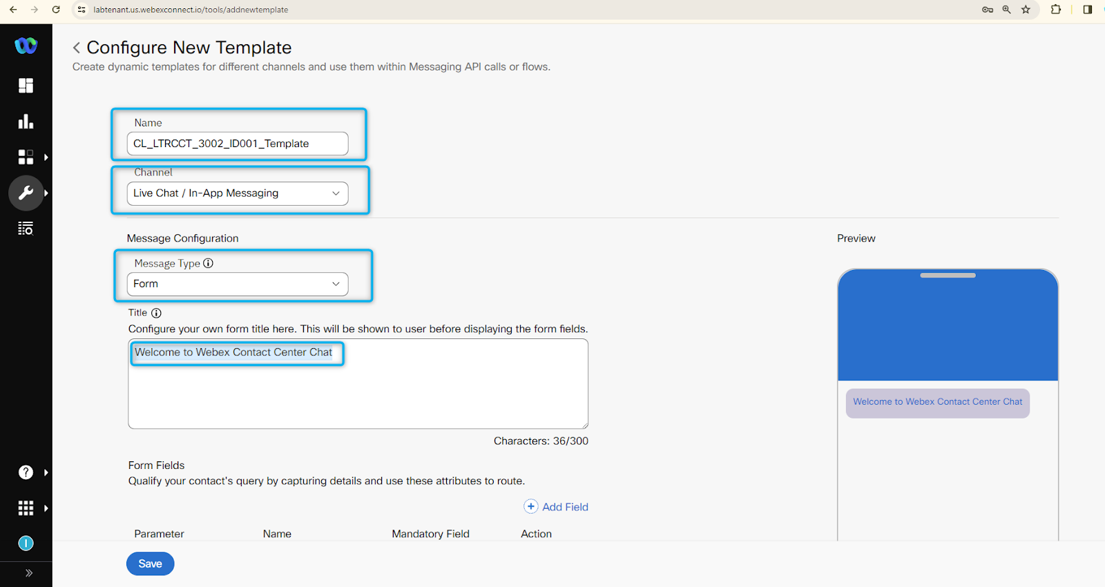 - 3(Read Only). This template is configured to request Name and Phone number before you start the chat. (Please don’t do any changes with this template as it all users Webex Connect Flows.)