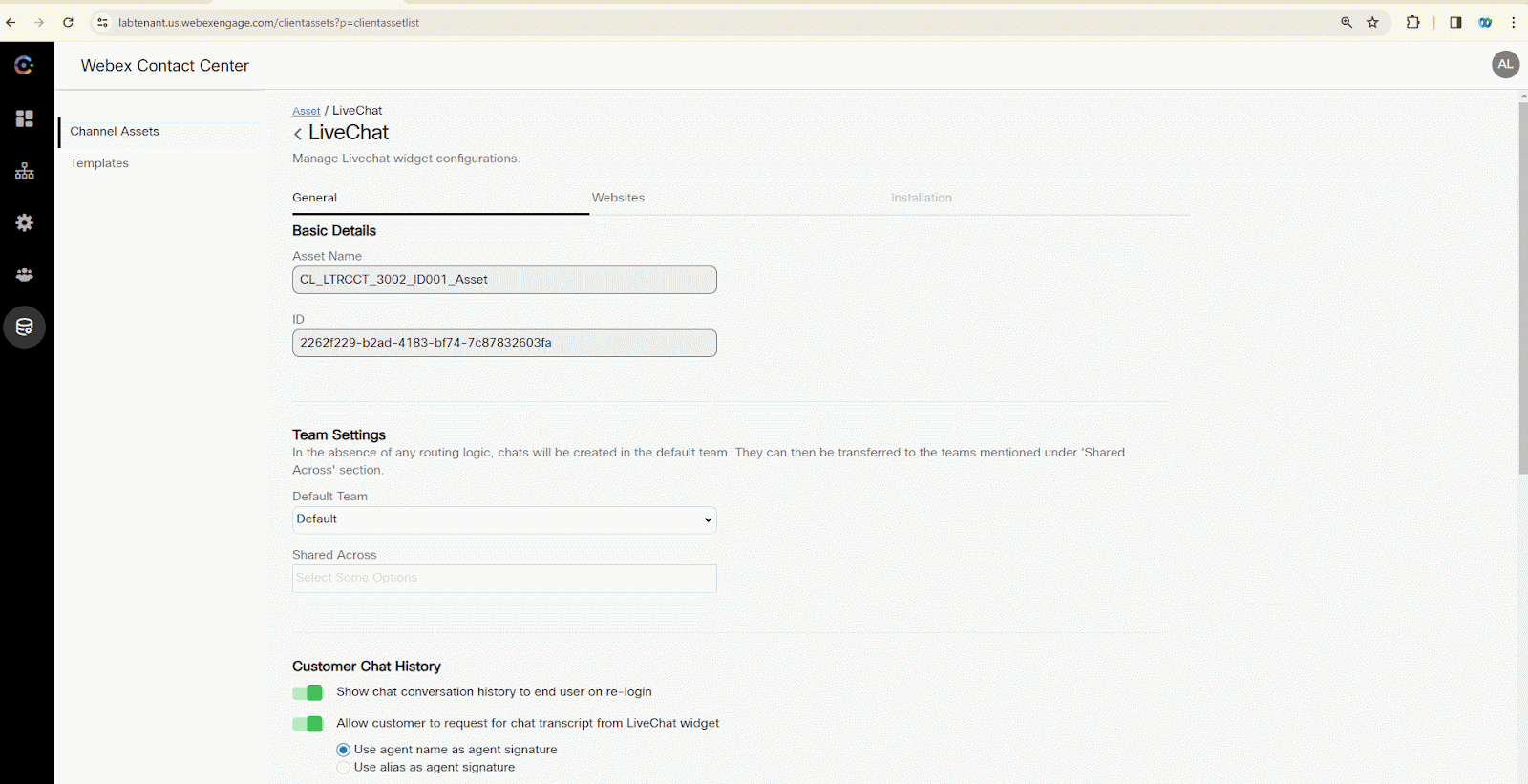 Through the Asset ID, the platform identifies how the chat should appear, which flow it should utilize, and to which Webex Contact Center Entry Point and queue it is bound.