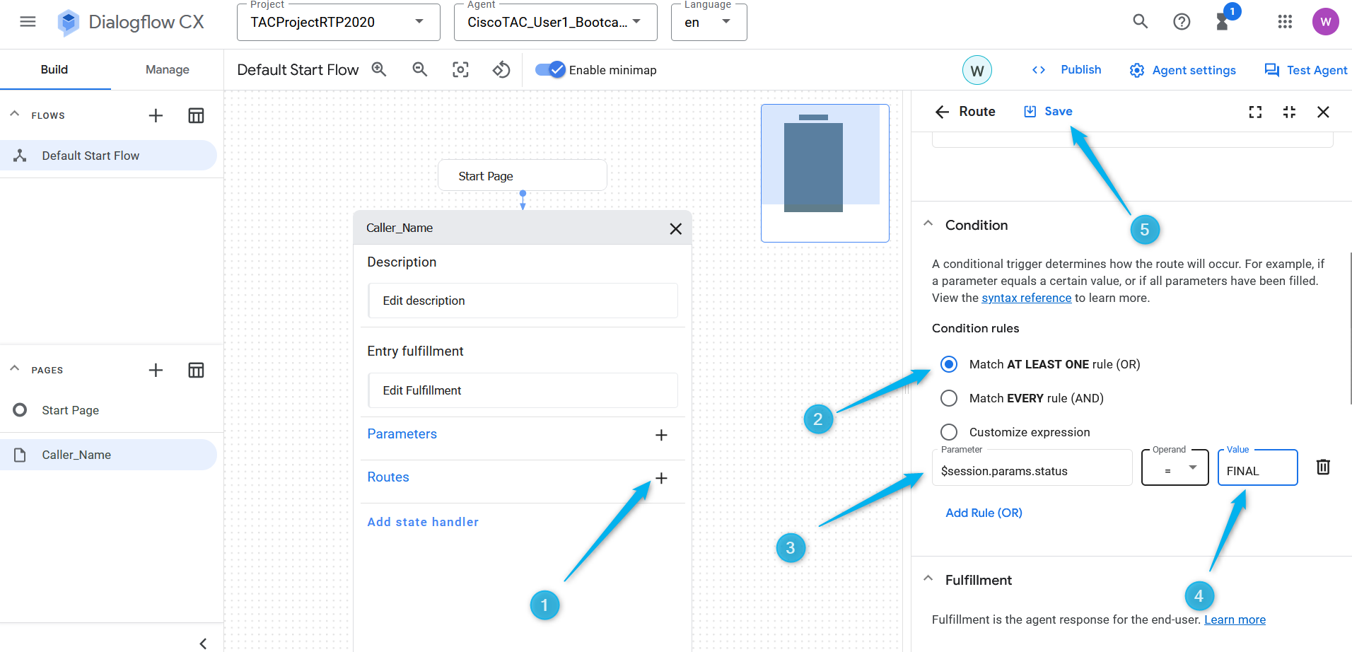 Step 6. Configure Routes in Caller_Name page. Click Routes, on the right window scroll down to Condition and set the condition $page.params.status = "FINAL". Click Save.