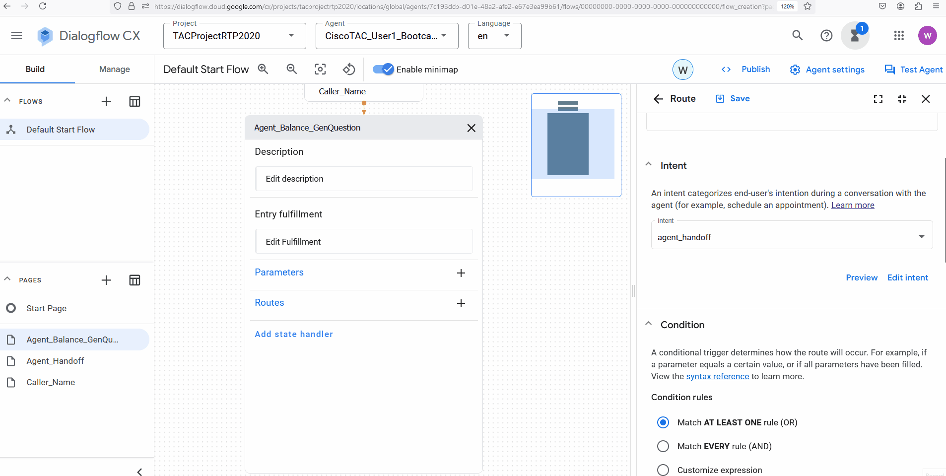 Step 2. Open up Agent_Balance_GenQuestion page, add a new Route, select intent general_question. Scroll down to the transition and connect it to General Question page.